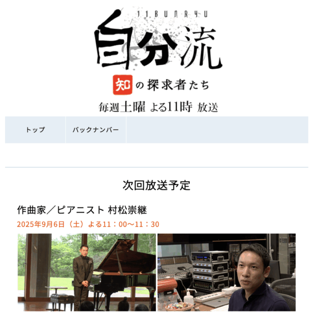 2023年に放送された、村松崇継出演の『自分流 知の探求者たち』が、2025年9月6日(土)午後11時から BS朝日にて放送されます。 皆さま、是非ご覧ください! ◆番組名 「自分流 知の探求者たち」(村松…