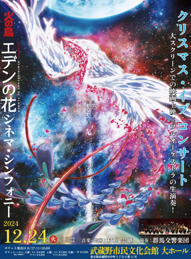 映画『火の鳥 エデンの花』シネマ・シンフォニーが、再び、2024年12月24日(火)、武蔵野市民文化会館大ホールにて、群馬交響楽団の演奏、村松崇継の音楽・指揮で開催されることが決定いたしました! 映画全編を大スクリーンに…