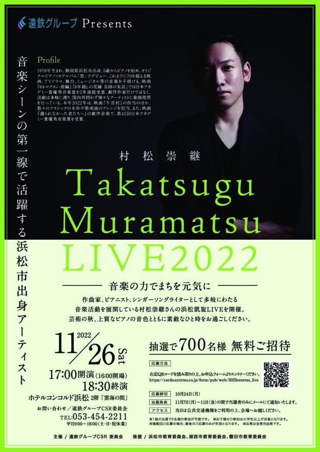 遠鉄グループPresents 村松崇継 LIVE 2022 浜松公演が決まりました。 皆さま、是非、ご応募ください! 2022年11月26日(土) 開場16:00/開演17:00 会場 : ホテルコンコル…