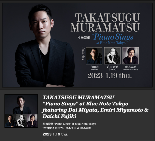 2023年1月19日(木)に、ブルーノート東京にて、『村松崇継 “Piano Sings” at Blue Note Tokyo featuring 宮田大, 宮本笑里 & 藤木大地』のライブ公演が決まりました。…